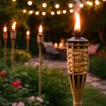 Antorchas pensadas para exteriores que combinan iluminación ambiental con efecto repelente en zonas abiertas.